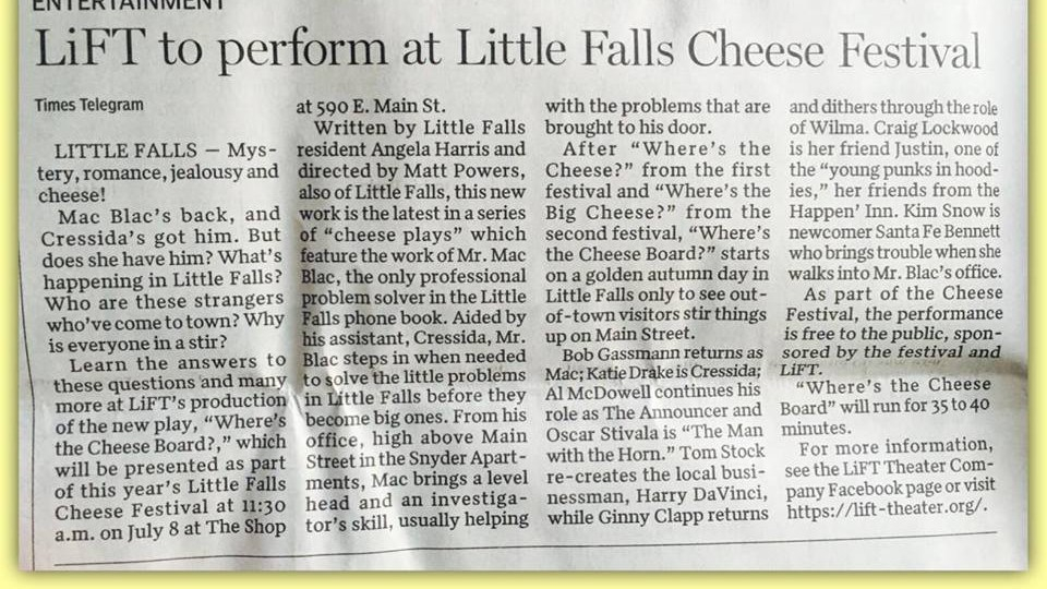 The Little Falls Cheese Festival was a resounding success! And LiFT performed Angela Harris’ “Where’s the Cheese Board” to a standing room only crowd. But, for all of you who missed it, follow the links below to watch the performance!