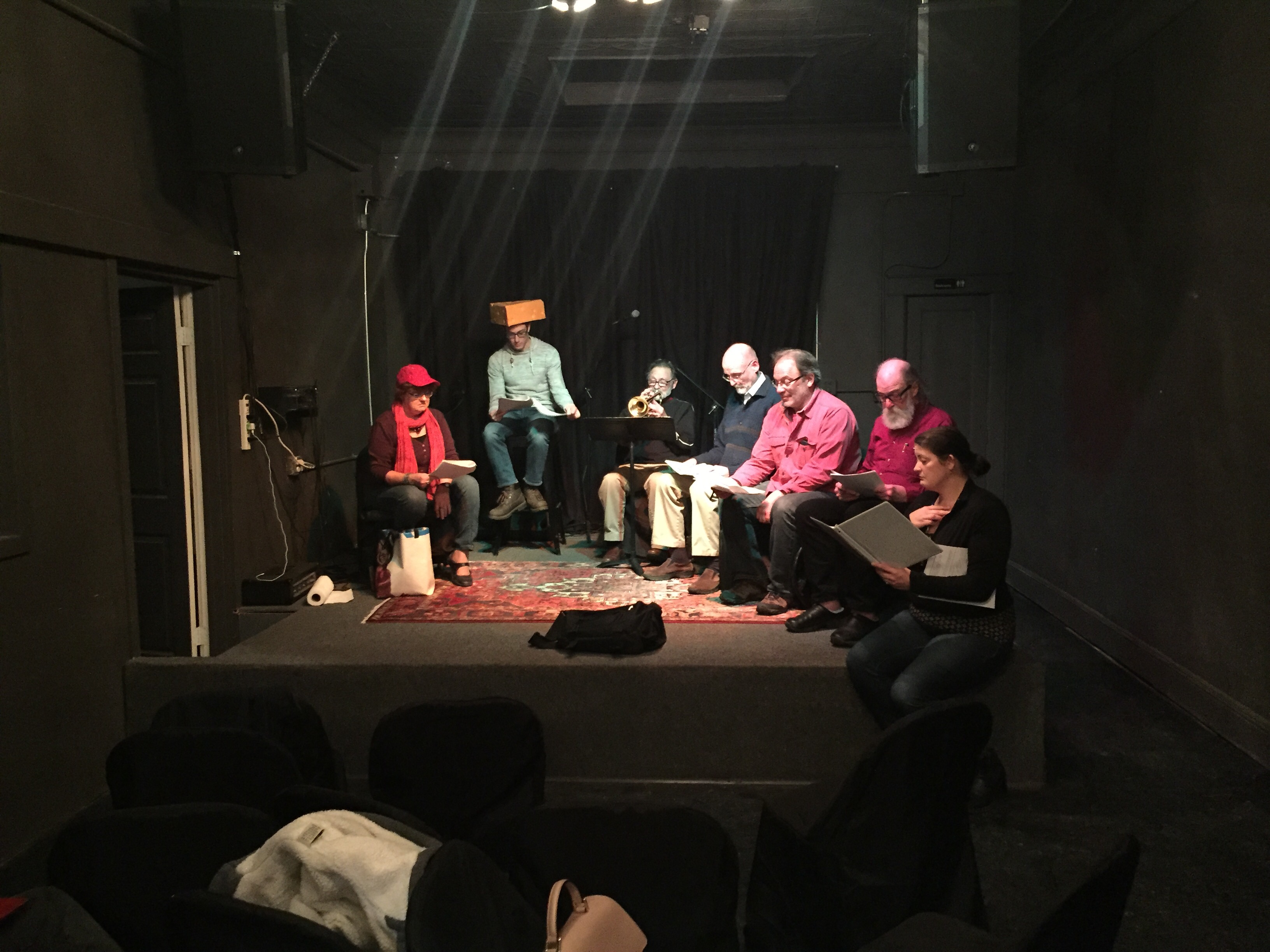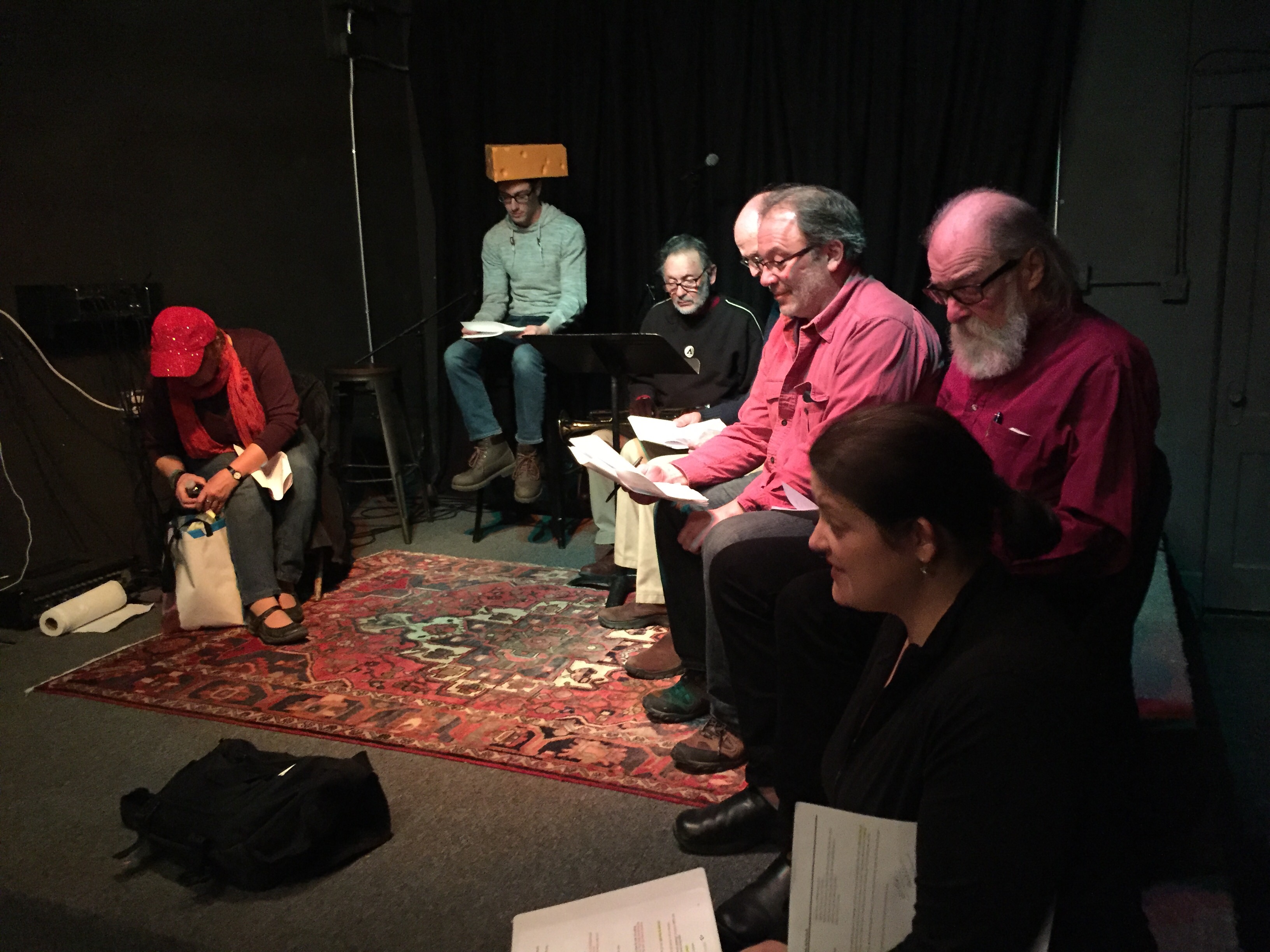 The full cast reading the first few pages. From left to right: Katie Drake, Tom Stock, Cindy Quackenbush, Ginny Clapp, Tucker Lester, Al McDowell, and Oscar Stivala.